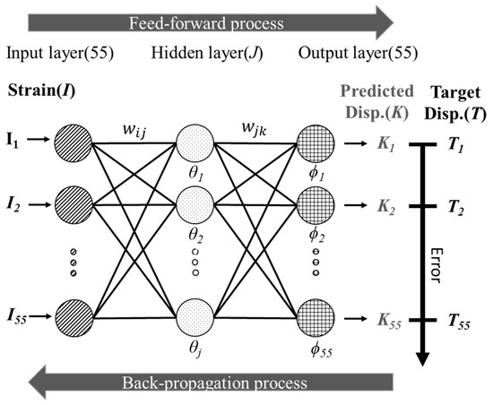 ANNs are computer algorithms that simulate human central nervous system information processing. When a human brain receives information, it is processed in the central nervous system and a final decision is made. The nervous system is made up of cells called neurons, and ANNs have neuron-like nodes. ANNs have a special ability to define the correlation of data in nonlinear relationships [33]. The neural network, first introduced by McCulloch and Pitts [50], has since been developed into various types of network models. Among these, the most efficient and widely used model is the multilayer feedforward neural network (MFNN) [51]. The structure of a general MFNN assuming the number of hidden nodes is J is shown in Figure 8. As shown in the figure, the MFNN consists of an input layer for inputting data, a hidden layer for computing with the input data, and an output layer for predicting the target value. Each layer consists of many nodes. The nodes of each layer are mathematically connected to the nodes of adjacent layers (input layer–hidden layer, hidden layer–output layer). Weights are assigned to the connections between layers. In addition, a bias is assigned to each node of the hidden layer and the output layer. In order for the ANN to accurately predict the target value, the optimal weight and bias should be determined, which is done through training. The process of training an artificial neural network is as follows.