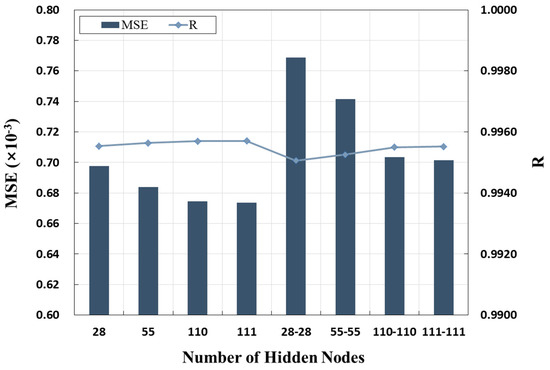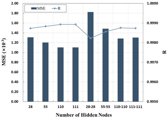 - The number of nodes in the input layer and the output layer is already determined because it is equal to the number of variables that are input and output, respectively, for the problem to be studied [54]. Therefore, the number of nodes in hidden layer is the only variable. There are no general rules for setting the number of hidden nodes [53]. The number of nodes proposed by Zhang et al. was used [55]. In their study, they proposed n/2, n, 2n, and 2n + 1 for the number of hidden nodes, where n is the number of input nodes. In this study, as the number of nodes in the input layer is 55, 28 (n/2), 55 (n), 110 (2n), and 111 (2n + 1) was used as the number of nodes in the hidden layer.