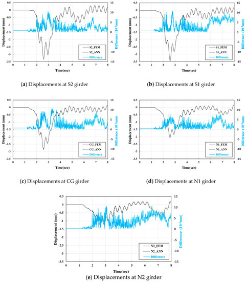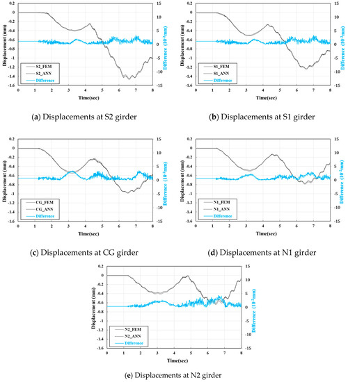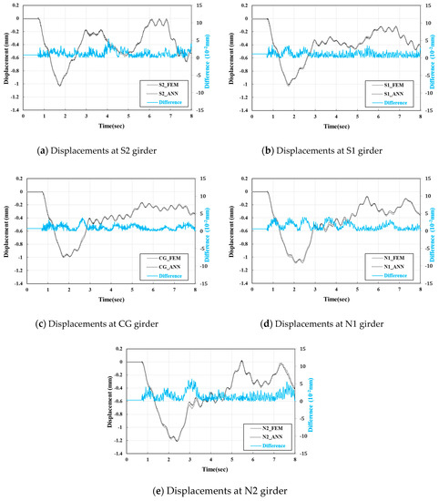 The test procedure was as follows. The strain obtained from the analysis of a load scenario that was not used for training was input to the ANN trained as described in Section 3.1. The trained ANN can predict displacement (output) immediately, which is one of the advantages of ANN. Then, the displacement predicted by the ANN was compared with the displacement obtained from the analysis. The data used in this test were those for the one load scenario for each of the three velocities (40 km/h, 60 km/h, and 80 km/h) that were not used for training, as mentioned in Section 2.2.3. All ANN architectures trained as described in Section 3.1 were tested, and the test results were reviewed. For testing, as the output value is immediately predicted after the input is entered into the trained neural network, the training time is not indicated separately. The test results are shown in Table 6, and the error for the load scenario at 40 km/h is shown in Figure 10. From the results for 40 km/h, when there was one hidden layer, the minimum and maximum MSE values were 0.67 × 10−3 (case 4) and 0.70 × 10−3 (case 1), respectively. The minimum and maximum R values were 0.995533 (case 1) and 0.995705 (case 4), respectively. When there were two hidden layers, the minimum and maximum MSE values were 0.70 × 10−3 (case 8) and 0.77 × 10−3 (case 5), respectively. The minimum and maximum R values were 0.995058 (case 5) and 0.995519 (case 8), respectively. Compared to the training results, the accuracy rankings for the structures with 110 and 111 hidden layers differed. However, as the difference is very small, it is considered that the test results are similar to the training results. Similar results were obtained for 60 km/h and 80 km/h. The test MSE values for 40 km/h and 60 km/h are smaller than the training MSE values, and the test MSE values for 80 km/h are larger than the training MSE values. This is because the MSE is affected by the magnitude of the absolute value. In addition, a comparison of the R values shows that the R value in testing was smaller than that for training for all velocities. Therefore, it is considered that the test results are slightly reduced in accuracy compared to the training results. However, we can see fairly good test results for MSE and R overall. Particularly in the cases with one hidden layer, a higher accuracy is shown. Therefore, it can be confirmed that the ANN was not overfitting, indicating that training and testing progressed very well.