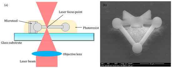 The microtools were fabricated using a commercial 3D direct laser writing setup (Nanoscribe GmbH, Germany) via 2PP. The system employs a femtosecond fiber laser with a wavelength of 780 nm and a pulse length of 100 fs. The microtool is fabricated by solidifying the photoresist through a laser directly that scans along a predetermined path. With the advantage of 2PP, this method can achieve a high resolution of 100 nm, which is beneficial for the fabrication of precision microstructures.