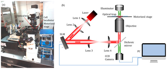The invention of optical tweezers has allowed scientists to develop an unprecedented manipulative ability at the single-cell level [1,2,3]. Focused laser beams, which can trap biological cells, cell organelles, and DNA bundles in a confined space [4,5,6], are opening up unexplored research areas that focus on single cells. In many biological and biomedical experiments, such as cell-to-cell interaction [7], cell sorting [8], and cell mechanical stiffness characterization [9], single-cell analysis has become feasible due to the customization of optical traps via light field waveform modulators [10,11]. Cell transportation has attracted increased attention due to the fact that cell positioning is usually a basic and vital technique that is required in single-cell analysis [12,13,14,15,16,17,18,19].