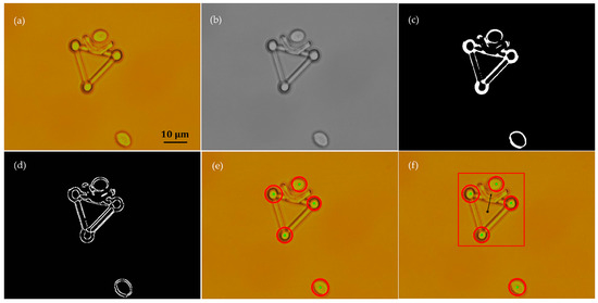 Cell positions were detected using a method that is similar to that presented in detail in other studies [22,43]. In this study, only the image processing algorithms for the microtool posture recognition are introduced. As a representative demonstration, Figure 6 shows the procedures of image processing to recognize the microtool from the mixture of a microtool and two cells. First, the original color image (Figure 6a) was transformed into a grayscale image and the Gaussian filter was utilized to smoothen the noise in the image (Figure 6b). Then, Otsu’s method was introduced to obtain a threshold value and separate the cells and microtool from the background. The global optimal threshold value was selected by maximizing between-class variance. After the image was binarized (Figure 6c), the Sobel operator was used to recognize the edges of the objects (Figure 6d). The three handling spheres of the microtool and two cells were subsequently located with the Hough transform (Figure 6e) [46]. Finally, the poses of the microtool, such as position and direction, can be calculated on the basis of the sizes of the identified contours and geometric position relationship of the located microspheres (Figure 6f).