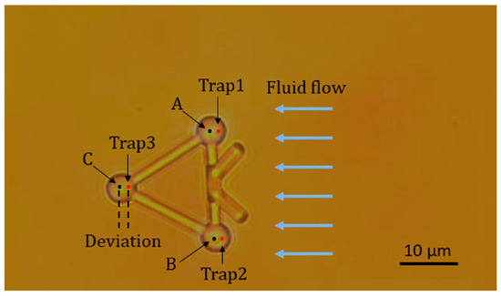 In the first experiment, a viscous drag force method was introduced to test the movement of the microtool in optical traps and fluid flows. Figure 7 illustrates the geometry of this experiment. First, a microtool was trapped and immobilized in the suspending medium. To avoid friction and collision between the microtool and culture dish, the microtool was lifted 1 µm from the bottom of the culture dish. At this moment, the positions of the traps, i.e., Trap1, Trap2, and Trap3 in Figure 7, coincided with those of the microtool handling spheres, i.e., A, B, and C in Figure 7, respectively. Then, the motorized stage was moved in a defined velocity and applied to the fluid flow passing the microtool. The microtool handling spheres would deviate from the traps and be immobilized in new balanced positions under the dragging force of the fluid flow and trapping force of the traps. By recording the positions of the microsphere before and after moving the motorized stage, we could obtain the deviations of the optical handling spheres from the optical traps. Figure 8 shows the deviations of A, B and C from optical trap centers as functions of fluid flow velocities when the laser power of each optical trap was set to 0.3 W. We observed that the deviations of A, B, and C are nearly identical, thereby demonstrating positive stability and balance of the microtool under optical traps and fluid flows. Furthermore, we observed that the deviations are no larger than seven-tenths of the sphere radius until the velocity of the fluid flows increases to 30 µm/s, which exhibits high trapping efficiency and stiffness. The experimental results lay the groundwork for the subsequent translational and rotational manipulation of the microtool.