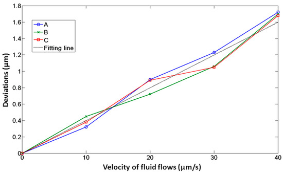 Deviations of optical handling spheres, namely, A, B, and C, of the microtool as functions of fluid flow velocities when the laser power of each optical trap is 0.3 W.