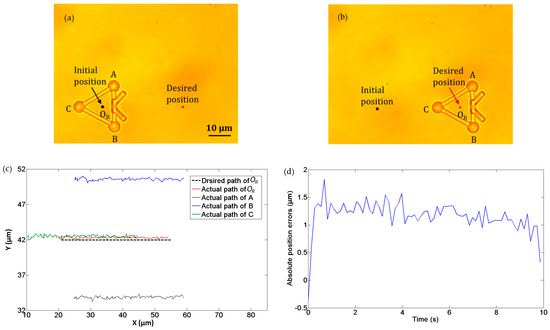 In the second experiment, we demonstrated the translational movement of the microtool as manipulated by optical tweezers. Three optical traps were created to trap the three handling spheres of the microtool, i.e., A, B, and C in Figure 9. The microtool was transported forward along a straight path at a velocity of 3.5 µm/s. Figure 9a and b depict the initial and desired positions of the microtool, respectively. In addition, Figure 9c illustrates the desired and actual transport paths of the microtool, where the black dotted line denotes the desired path of the microtool center OR, and the red line indicates the actual path of OR. Notably, the microtool was successfully transported forward with the optical traps. Figure 9d shows the absolute position errors of the microtool center OR in transport, which is less than 2 µm.