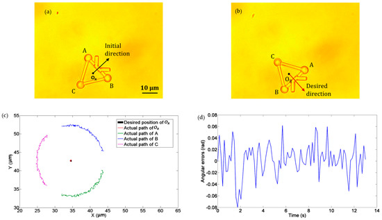 In the third experiment, we demonstrated the rotational movement of the microtool under the operation of optical tweezers. Three optical traps were created to trap the three handling spheres of the microtool, namely, A, B, and C in Figure 10. The microtool was rotated clockwise about its central point OR at an angular velocity of 0.12 rad/s. Figure 10a and b depict the initial and desired directions of the microtool, and Figure 10c illustrates the desired and actual poses of the microtool, where the black dot denotes the desired position of OR and the red dot indicates the actual path of OR. Notably, the microtool was stably rotated clockwise with the optical traps. Figure 10d shows the absolute angular errors of the microtool in transport, which is less than 0.1 rad.