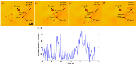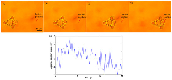 Figure 11a–d show the transportation of one yeast cell under the manipulation of the microtool operated by optical tweezers. In this experiment, no obstacle was situated in the workspace, and the desired position was marked by a star. The target cell was pushed along a straight path to the desired position at a velocity of 2.5 µm/s. During transportation, the cell remained inside the V-shaped head. Figure 11e shows the absolute cell position errors during the manipulation, the maximum of which is less than 2.5 µm.