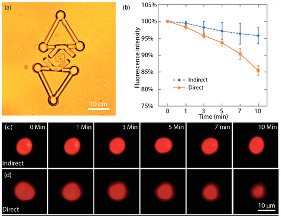 For indirect manipulation, a yeast cell was trapped between the V-shaped heads of two microtools, as shown in Figure 13a. In this manner, the cells are stably captured between the two microtools and its fluorescent images could be expediently taken. Figure 13c shows that although the imaged cell shape slightly changed due to the Brownian motion, the size of the red area displayed no obvious reduction during the indirect manipulation. Additionally, the average fluorescence intensity, measured by ImageJ [52], at 10 min only dropped to 96% ± 2% (mean ± SEM) compared with that at 0 min. For direct manipulation, Figure 13d shows a series of the fluorescence images of a yeast cell that was directly trapped by optical tweezers. During the direct trapping, the posture of the cell remained unchanged. However, the size of the red area was considerably reduced. Moreover, the fluorescence intensity of the cell under direct optical manipulation dropped to 86% ± 1% (mean ± SEM) compared with that at 0 min. Figure 13b shows the time-dependent change of fluorescence intensity under direct and indirect optical manipulation. The results suggest that during the long-time trapping, indirect optical manipulation with the proposed microtool induces considerably less photobleaching to cells compared with direct optical manipulation. This finding also indicates that laser exposure to the cells is effectively reduced.