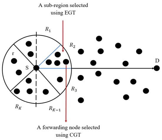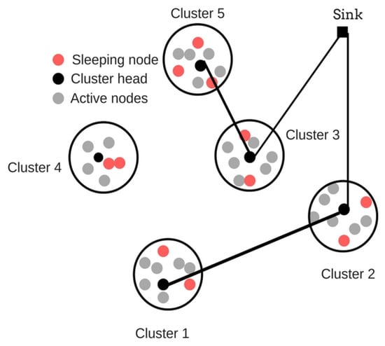 A wireless sensor network (WSN) consists of sensor nodes with the ability to sense, process, and communicate. The nodes are fixed in most cases and are subject to limited human intervention. It is a special kind of ad hoc network with minimal or no mobility []. It helps us monitor and analyze any unknown environment. Typically, WSNs are data centric. Despite requesting data specific to a node, data are collected based on certain attributes, like temperature and humidity. Therefore, many sensors must be deployed to accurately reflect the physical attributes in a given area []. The progress in recent technology has made it possible to deploy thousands of sensor nodes within a network, which are programmable and can sense multiple parameters. Wireless sensors can be deployed at the site of interest without any prior organization. This is a great advantage because it decreases the installation cost and saves time. Moreover, replacing a wired macrosensor with smaller wireless sensors for the same cost can provide us with a wider range of benefits. Another advantage of WSNs is that the failure of one sensor node does not affect the whole network, because there are adjacent nodes collecting a similar kind of data in the target region [].