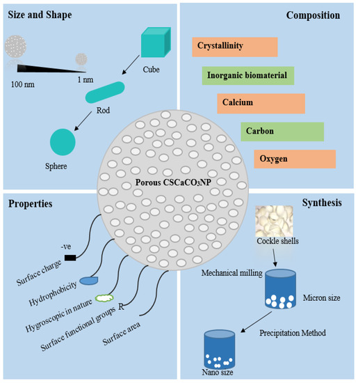 Directing to the recent trend of synthesizing the CSCaCO3NP, the early synthesis of CSCaCO3NP was governed and supported few years back by the pioneering fundamental study of Islam et al. [101], who introduced a basic preparation procedure in transforming the solid structure of cockle shells into a pure nano-sized powder by developing a novel method through the use of simple mechanical stirring in the presence of BS-12 surfactant (dodecyl dimethyl betaine) which is a bio-mineralization material that aids smaller sized formation of nanoparticles. Later, a minimum procedural steps was adopted with no addition of impurities and was performed under room temperature [15]. The advanced development on the production of CSCaCO3NP has led to the use of a high pressure homogenizer technique via microemulsion system in the presence of polysorbate 80 surfactant (Tween 80) to obtain a modified homogenous nanosized particles Kamba et al. [91]. Although, the technique demonstrated promising results for drug delivery system, it had considerable setbacks such as the use of expensive and complex equipment with high operation energy input. Therefore, the top-down method adopted by the pioneering researchers with subsequent improvements that led to the better spherical size obtained recently, appeared to be a more appealing and convenient option for the synthesis of CSCaCO3NP at large scale production. Hence, the method is simple at low cost and environmentally friendly, which involves little procedural steps without stringent temperature management. In addition, expensive hazardous chemicals or any carbonation methods and time-consuming gas bubbling are exempted. The mechanical grinding type of top-down method adopted, involves a suitable readily available and more cost-effective instrument in the presence of BS-12 surfactant, which is a biomineralization catalyst. Previous work reported rod-shaped nanoparticles for CSCaCO3NP [91,101], modifications and improvement has led to a successful formation of homogenous spherically shaped CSCaCO3NP [10,11,17,18,106]. An overview of the synthesis and characterization of CSCaCO3NP is shown in Figure 2.