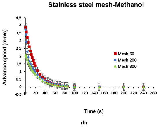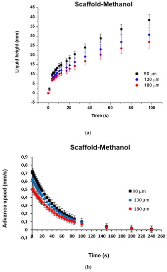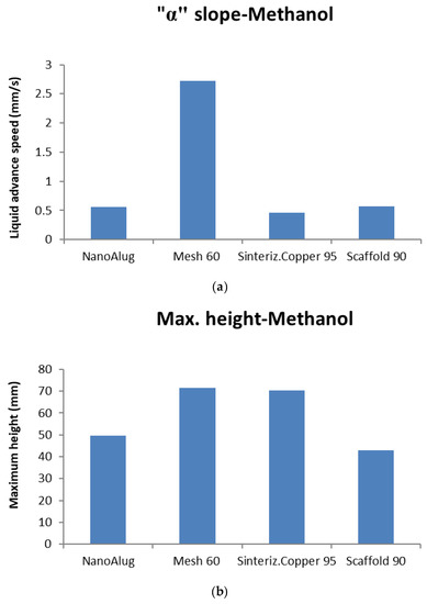 The first test was performed to measure the liquid pumping capacity and capillary action of wicks created by different techniques (sintering, mesh, SLM). The wick specifications were a speed of advance of 0.031 mm/s at a height of 30 mm imposed by a particular 80 W LHP application. It was concluded that the faster the ascent of the fluid, the better the wick performance. With regard to capillary action, the SLM wick (scaffold) presented a 23% faster response than the sintered powder, although the stainless-steel mesh offered the fastest response.