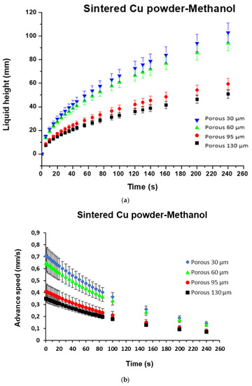 Experimentation is presented as an efficient means of obtaining the flow velocity through a porous media, the capillary action curve, which will be obtained by measuring liquid height versus time for several materials and techniques: (i) sintering, (ii) meshing, and (iii) SLM. The experimental method is also the most accurate way of determining the permeability of a medium as porous as an LHP wick with a complex internal structure. In this case, samples with different pore sizes (D) were built through two different technologies, sintering and SLM, and were finally tested.