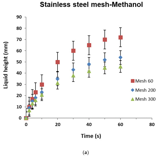 Again, as the aperture width decreased, the maximum attainable height increased: at 75 mm for mesh 60, 58.8 mm for mesh 200, and 48.7 mm for mesh 300. In summary, the lower the pitch, the higher the liquid height and the stronger the pumping capacity-capillary action, as shown by the α slope in Table 4. The flow velocity (α) in mesh 60 was 170% faster than that of mesh 300, and 103% faster than that of mesh 200.