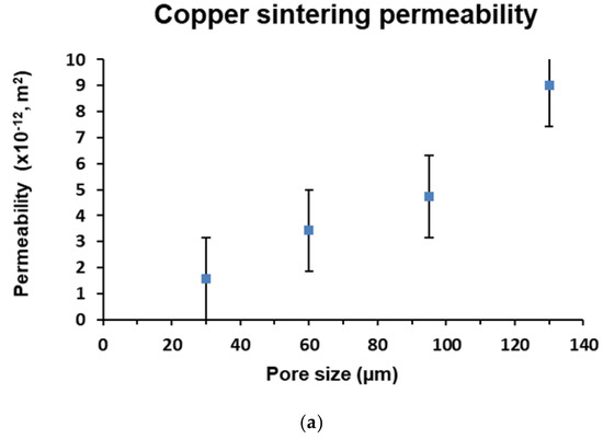 Hence, the use of permeability measurement devices [35,36,37,38,39] permits indirect determination of wick permeability by measuring the pressure loss (ΔP) and flow rate through the medium. The flow at pore scale must be in the Darcy’s regime, which means that the Reynolds number (Re) must be Re < 10 [40].