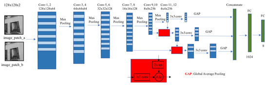 Figure 3 shows the structure diagram of our regression-based HomographyFpnNet model for predicting the pixel offsets of the four corners of image_patch_b relative to those of image_patch_a when image_patch_b is warped to image_patch_a. HomographyFpnNet uses the VGG architecture (the deep convolutional network developed by Oxford’s Visual Geometry Group (VGG) for object recognition, which is characterized by its simplicity, using only convolutional layers stacked on top of each other to increase the depth of the network and using max pooling layers to reduce the dimensionality of the feature maps) [21], which was also used by HomographyNet [20]. The model input is a two-channel image of size pixels. In other words, the two grayscale input images associated by the homography transformation are stacked in a channel manner and fed into the model network. After extracting features through stacked convolutional layers, HomographyNet [20] uses the features of the last convolutional layer to predict the four-point homography values through two fully connected layers, meaning that HomographyNet only uses single-scale convolutional features. In contrast, the ORB+RANSAC method commonly uses multi-scale ORB features to improve the accuracy of its homography estimation. Inspired by this, we propose the use of multi-scale deep convolution features for the homography estimation. Specifically, as shown in Figure 3, we used Feature Pyramid Network (FPN) [24] to fuse the convolution features of three different scales, and then globally averaged and concatenated these three scale convolution features (, , and ) to obtain the final one-dimensional features. That is, the feature map of conv12’s output is upsampled to and then merged with the feature map of conv10’s output (which undergoes a convolutional layer to adjust channel number to 256) by element-wise addition to generate new feature map. Similarly, the new feature map is upsampled and then merged with the feature map of conv8’s output to generate new feature map. To reduce the aliasing effect of upsampling, each merged map undergoes a convolutional layer to generate the final feature map. Finally, as in HomographyNet, two fully connected layers are used for the regression of the four-point homography values.