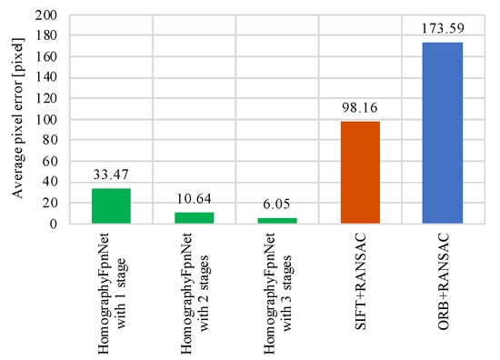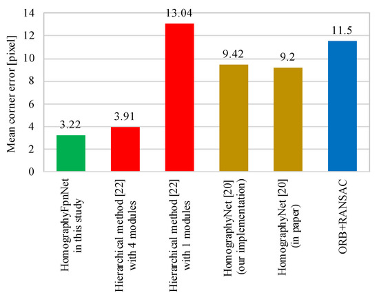 We tested the mean corner error of the trained model on the 30,000 test samples generated from the COCO 2014 test dataset. The mean corner error was obtained based on the calculation of the L2 distance between the estimated and the ground truth corner locations, for the average of the four corners and all test samples. As shown in Figure 4, our HomographyFpnNet model had a mean corner error of 3.22 pixels on the 30,000 test samples generated from the MS-COCO 2014 test set. Compared with HomographyNet, the mean corner error decreased from 9.42 pixels (our own implementation, 9.2 pixels in the published report [20]) to 3.22 pixels, that is, the mean corner error decreased by 65%. Compared with the hierarchical method [22], our HomographyFpnNet model with an error of 3.22 pixels performed better than their four-stage model with an error of 3.91.