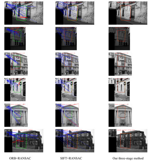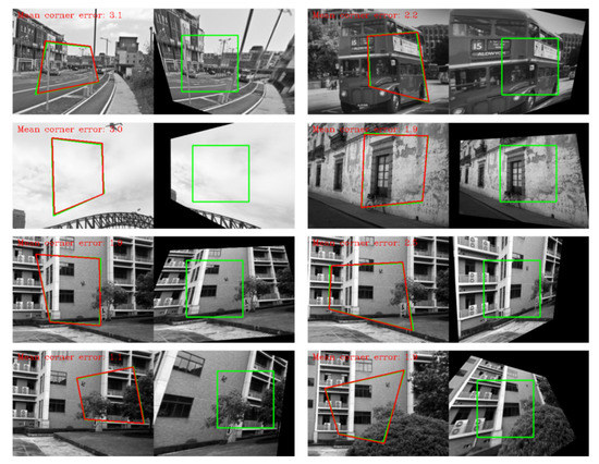 As shown in Figure 8, the ORB+RANSAC method performed poorly in the homography estimation of non-center-aligned image pairs, with a mean corner error of 173.59 pixels. The method of SIFT+RANSAC performed better and obtained a mean corner error of 98.16 pixels, while the detection speed of SIFT features was much slower than that of ORB features. The reason that ORB/SIFT+RANSAC methods performed poorly in the homography estimation of non-center-aligned image pairs is that the size of image_patch_b is smaller than image_a, causing many mismatches of ORB/SIFT feature points between image_a and image_patch_b. Our hierarchical HomographyFpnNet performed much better in this task, and the mean corner error of the three-stage model was only 6.05 pixels. Figure 9 shows some prediction results obtained with our three-stage hierarchical HomographyFpnNet method compared with those obtained with ORB/SIFT+RANSAC methods, in which the corners of the green boxes are ground truth four-point homography values and the corners of the red boxes are predicted results.
