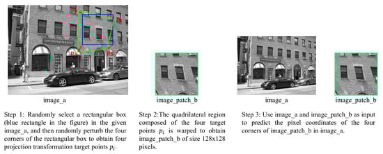 We chose 118,000 images from the trainval set of the MS-COCO 2014 dataset to generate training samples for the homography estimation, and 10,000 images from the test set of the MS-COCO 2014 dataset to generate test samples. As shown in Step 1 in Figure 6, all images selected from the MS-COCO 2014 dataset were converted to single-channel gray-scale images and three samples were generated from each selected image to increase the capacity of the resulting dataset. To do this, three rectangles (blue rectangle in Figure 6) of size (), excluding a boundary region of pixels in the x-direction and pixels in the y-direction, were randomly selected from each image. A random perturbation in the range of pixels for the x-coordinate and for the y-coordinate was added to the pixel coordinates of each corner of the rectangle, and the perturbation values of the four corners were the target four-point homography values (green quadrilaterals in Figure 6). In Step 2, the target four-point homography was warped to generate image_patch_b of size pixels. In Step 3, the image_a (resized to pixels) and image_patch_b pair, along with the target four-point homography values, were fed as inputs to the network.