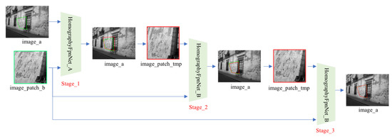 In Stage_1, we took the input image pair of image_a and image_patch_b and used the HomographyFpnNet_A model to directly predict the pixel coordinates of the four corners of image_patch_b in image_a. The training triplet sample of Stage_1 was (image_a, image_patch_b, ), j = 0, 1, 2, 3. In the following Stage_i (i = 2, 3), we first used the prediction result of the preceding stage (Stage_i − 1) to calculate the homography matrix between image_a and image_patch_b, and then used to transform the area enclosed by the predicted four corners of Stage_i-1 in image_a (red quadrilaterals in Figure 7) to a new image_patch_tmp of size pixels. At the same time, we used to transform the ground truth four-point homography values to image_patch_tmp to provide target regression values for Stage_i. We then took the input image pair of image_patch_tmp and image_patch_b and used the HomographyFpnNet_B model to predict the pixel offsets of the four corners of image_patch_b in image_patch_tmp relative to the four corners of image_patch_tmp. Finally, we used the inverse of to transform the predicted four corners of HomographyFpnNet_B back to image_a to get the predicted four corners of image_patch_b in the original image_a for Stage_i. The training triplet sample of stage_i was (image_patch_tmp, image_patch_b, ), j = 0, 1, 2, 3.