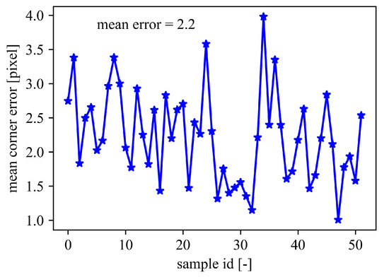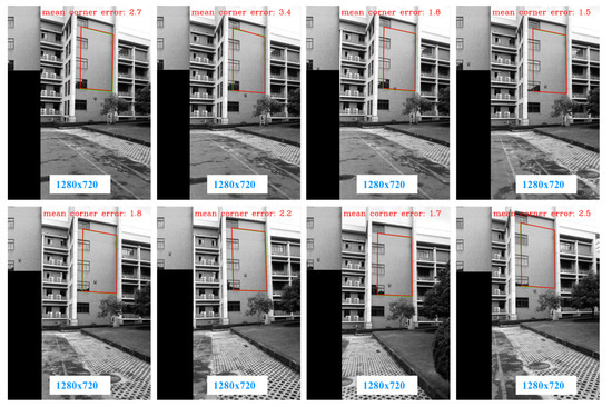 We conducted a homography estimation on the wall images of our wall-climbing robots using the previously trained three-stage hierarchical HomographyFpnNet model. The test wall images were decoded from the recorded video (one image per 2 s) and there were 52 images ( pixels) in total. We selected four fixed points on the wall and manually labeled the pixel coordinates of these four fixed points on each wall image. After conducting the four-point homography prediction with our three-stage HomographyFpnNet model, we resized the predicted four-point values back to the original image size, and then calculated the mean corner error; the mean corner error was computed in the image size of pixels.