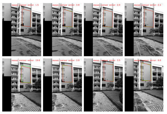 In the first experiment, for each image_a of wall image, we first warped the labeled four-point homography values (green box in Figure 10) to get image_patch_b, and then used the trained three-stage hierarchical HomographyFpnNet model and the input image pair (image_a, image_patch_b) to predict the four-point homography values (red box in Figure 10). The four-point homography estimation errors of our three-stage HomographyFpnNet on the 52 test wall images are shown in Figure 11, and the mean corner error of the 52 images was only 2.8 pixels. Figure 10 shows some prediction results on the wall images.
