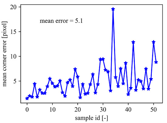 In the second experiment, we conducted a more difficult test. We used a single image_patch_b generated from the first wall image to estimate the four-point homography values between this image_patch_b and all test wall images. Experiment 2 was consistent with the actual use of the wall map of the wall-climbing robot. That is, we usually prepared one wall map image and then estimated the four-point homography between the wall map and all camera images. As can be seen in Figure 12, while the matched region of image_a is occluded by the wall-climbing robot, even though there is no robot in the corresponding image_patch_b, our model could still estimate the four-point homography values well due to the data enhancement strategy we used when training the hierarchical HomographyFpnNet model (described in th e Section 3.3). Figure 13 shows the prediction error when using a single image_patch_b, with a mean corner error of the 52 test wall images of 5.1 pixels. The mean corner error of 5.1 pixels in the second experiment was larger than the 2.2 pixels in the first experiment, and this increased error was mainly caused by the difference between the image_a and the fixed image_patch_b increasing over time. This is a problem that we will solve in the future, for example generating training samples of fixed image_patch_b and a changeable image_a from videos.