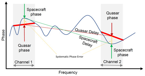 The blue curve shows the phase dispersion as a function of frequency, while the green line shows the average linear behavior. At the spacecraft tone frequency (arrows), the measured phase differs between the narrowband spacecraft measurement (green) and the wideband quasar measurement (red), resulting in systematic phase error. To minimize the systematic error, the on-board synthesized DOR signal should resemble the quasar one as much as possible [9]. Thanks to the differential nature of the measurement, the difference between the spacecraft and quasar delays produces an observable that minimizes calibration errors due to instrument dispersion, especially the ones due to phase ripples in the acquisition filter, thus providing enhanced performances [10]. The recent advancements in the field of on-board microelectronics, e.g., Digital Signal Processing cores for space applications, are enabling factors to develop the newest DOR paradigm based on broadband observables: Wideband DOR.