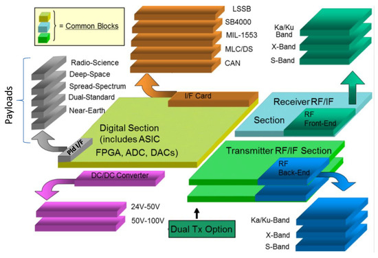 This transponder has been conceived as a common platform, composed of common blocks coupled with custom parts. The common platform includes: the Digital Section (ASIC, FPGA, DACs, ADC), the Transmitter Radio Frequency (RF)/Intermediate Frequency (IF) section and the Receiver RF/IF section. The custom parts include: the DC/DC Converters, the Programmable Read-Only Memory (PROM) Interface, the RF Front-End and Back-End sections and the Interface Card. The platform approach allows the TAS transponder to be very flexible and reconfigurable in terms of physical modules and mapped cores on the internal FPGA. Different missions will require different sets of DC/DC Converters, programmable read-only memories, interfaces and RF front-end and back-end. Conversely, the transponder core, composed of the digital and RF/IF sections, will remain unchanged [11,12]. The new transponder named Flexible Autonomous Transponder (FAT) has been derived from the TAS transponder heritage regarding Deep-Space, Radio-Science, Near Earth and Secure Spread-Spectrum TT&C product lines. The different functions are implemented in the following modules: