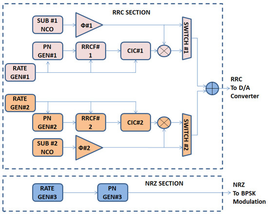 The proposed W-DOR core has been designed for with reference to Equation (2), with one NRZ- and two RRC-shaped signal components. Hence, the RRC and NRZ sections have, respectively, two and one data paths. A detailed description of the W-DOR core components is provided in the following subsections.