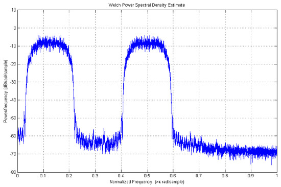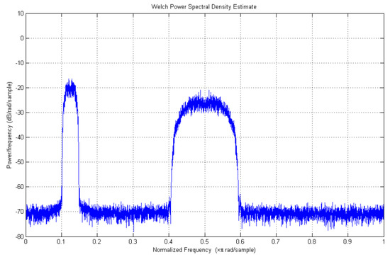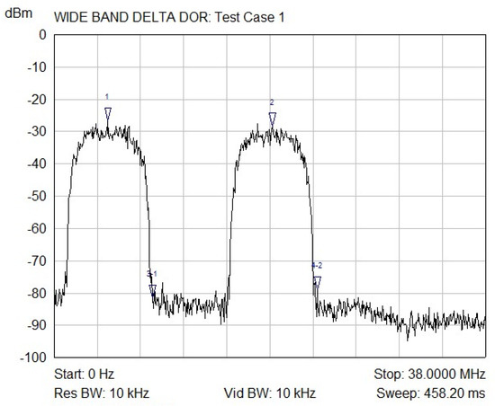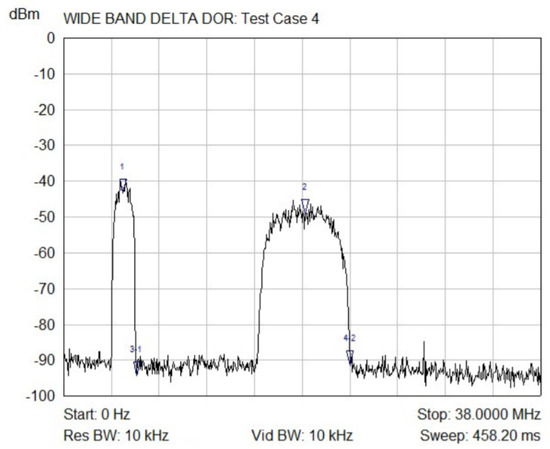 In particular, Figure 6 shows the measured output spectrum achieved with the subcarrier 1 at frequency F1/2 and subcarrier 2 at frequency 2F1, both modulated with the PN code at chip rate F1/2. In this case, the modulation index is set to 1 rad-pk. The DAC sampling frequency is about 76 MHz, thus the Nyquist window from 0 to about 38 MHz is reported. In Figure 8, the measured output spectrum corresponding to Test Case 4 is reported. In this condition, the subcarrier 1 at frequency F1/2 is modulated by a PN code at F1/8, while the subcarrier 2 at frequency 2F1 is modulated with PN code at rate F1/2. This test also shows the ability of the W-DOR to independently set the amplitude of each subcarrier.