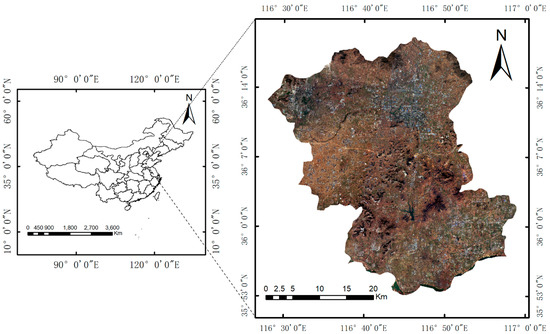 We used 21 GF-2 images covering Feicheng County, including six obtained on 20 February 2017, seven on 8 December 2017, three on 15 February 2018, and five on 16 March 2018. Each GF-2 image comprised a multispectral image and a panchromatic image. Each GF-2 image is divided into a multispectral and panchromatic image. The former is composed of four spectral bands (blue, green, red, and near-infrared), and the spatial resolution of each multispectral image is 4 m, whereas that of the panchromatic image is 1 m.