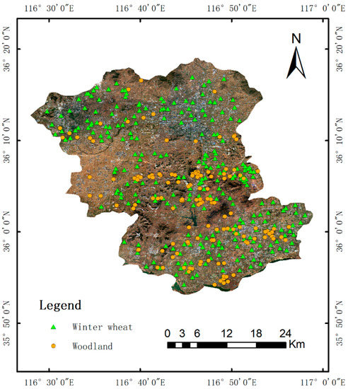 There are eight main land cover types in the images described in Section 2.2: developed land, bare fields, farmland, agricultural buildings, roads, water bodies, winter wheat, and woodland. Of these, developed land, bare fields, farmland, agricultural buildings, roads, and water bodies can be directly distinguished by visual interpretation in the ENVI software. In order to accurately distinguish between winter wheat and woodland, 391 sample points were located on the images, as shown in Figure 2. Of these, 135 sample points were from woodland areas and 256 were from winter wheat areas. As can be seen in Figure 2, the texture of the woodland area is coarse, the color changes greatly, and the shape is irregular. The texture of the winter wheat area is fine, relatively smooth, and the shape is generally regular. Awareness of these characteristics can help improve the accuracy of visual interpretation.