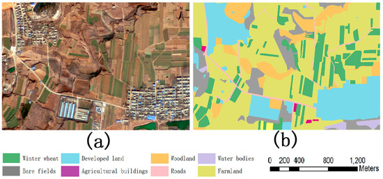 We created a label file for each image to record its category number. Each pixel was assigned a code value in the label file. Codes 1–8 were used to represent each land type in the label files. The task of labeling each pixel was performed using the visual interpretation function of ENVI. Figure 3 shows an image and its corresponding label.