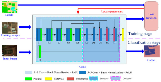The CEM model consists of a feature extractor and classifier; the feature extractor comprises an encoder and decoder (Figure 4), the fused GF-2 image and the corresponding label file were used as input. The band order of the image is red, blue, green, and near-infrared.