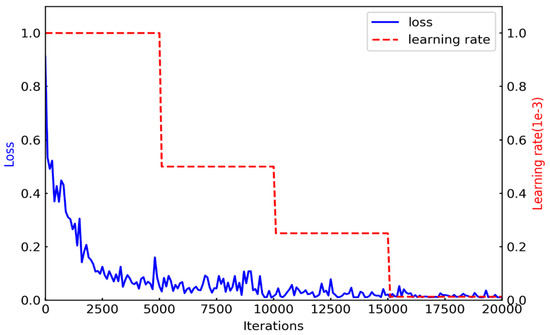 Figure 5 presents the CEM loss rate curve for training. As can be seen from the figure, as the number of iterations increases, the loss value decreases and it eventually tends to stabilize. The loss value decreases rapidly during the first 5000 iterations. From iteration 5000 to 15,000, the loss value fluctuates. After 15,000 iterations, the loss value tends to become stable. The initial learning rate set in the training phase is 0.0001, and the learning rate is reduced to half the existing value every 5000 iterations. It can be seen that as the learning rate decreases, the training loss value also slightly decreases within a certain range. This proves that the learning rate gradient has a beneficial effect on the training network.