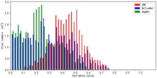 Considering the similarity in the structures of SegNet, RefineNet, and CEM, we introduced the difference between the maximum value of the category probability vector generated by the classifier and the next maximum value as an indicator to further illustrate the advantages of the CEM model structure. This indicator was termed category confidence. Figure 8 illustrates the category confidence distribution for the results of the experiment. The ratios of pixels at a lower confidence level of the comparison models are greater than those of the CEM model. This demonstrates that the feature value composition of the CEM model is superior to those of the SegNet and RefineNet models.