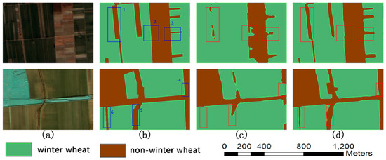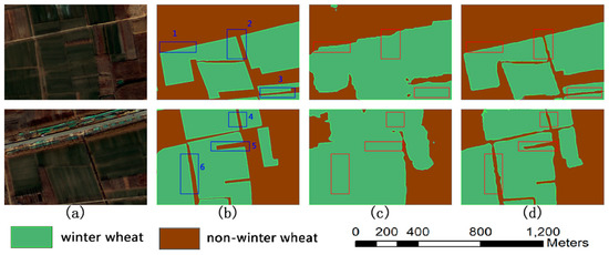 Figure 6 presents the extraction results of our model and those of two other models used for comparison with ours. Considering that the goal of this study was to extract crop planting areas, we use Figure 7 to show the results in which the other seven land use types are combined. We use code 9 to present the non-winter wheat. In Figure 6 and Figure 7, a total of 10 sub-images and their extraction results are shown. When selecting these 10 images, we ensured that each image contains winter wheat planting areas and that the other seven land use types appear at least once in an image. This is to enable us to visually compare the algorithms with these results. The first five images are dated 20 February 2017 and the other five are dated 16 March 2018.