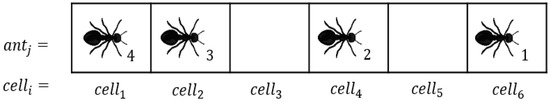 As specified by Equation (2), the new position of the given ant is calculated by adding the position of the ant at time t to the distance traveled in unit time . It is interesting to note that the dynamics presented in Equation (1) resemble the dynamics in the Nagel–Schreckenberg model where the velocity of an agent depends on the headway distance, whereas in the case of our model, the velocity of an agent depends on the pheromone concentration. This resemblance indicates that both models are analogous to each other, which indicates that there might be some similarities between the two traffic systems [29].