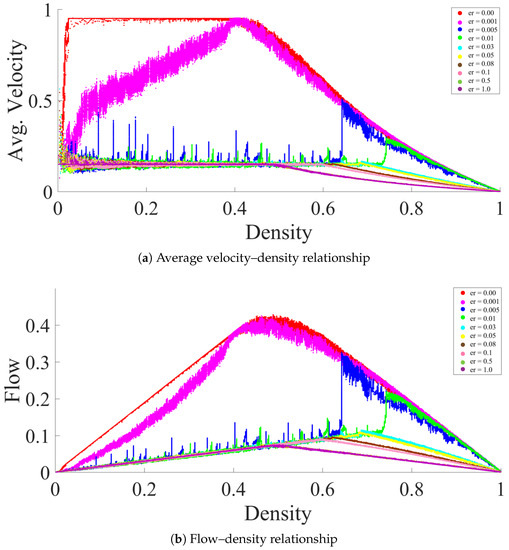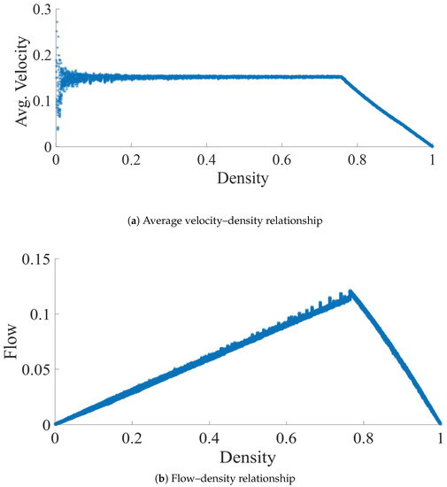 A fundamental diagram of the ATM simulation for different values is plotted: (a) average velocity–density relationship (b) flow–density relationship. Parameters other than were kept constant: cells, = 80, = 0.15.