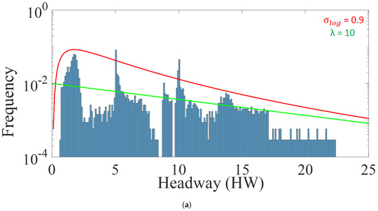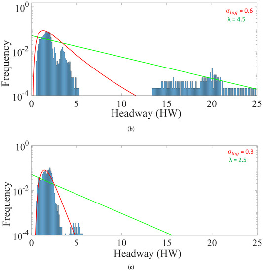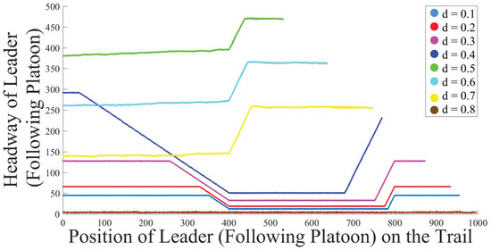 Furthermore, as shown in Figure 4, we analyzed the distance headway distribution in the simulation, where at lower d values, large distance headways were predominantly found, which indicates a random-headway distribution. The distribution at lower d values was well described by a negative exponential distribution. On the other hand, at medium to higher d values [0.2, 0.7], the distribution became much sharper with an increasing d value, indicating platooning. For these d values, the log-normal distribution appeared to provide the best fit. The above observations related to distance headway and platoon formation were similar to the empirical observations in [14]. On the other hand, we also observed that there were no or very few ants who traveled with intermediate headways, especially for medium d values [0.2, 0.4]. This can be explained by platooning dynamics, where ants with intermediate or smaller headway accelerate due to the presence of pheromones until they catch up with preceding ants (platooning), whereas ants with a headway greater than an intermediate value do not experience pheromones, thus maintaining their velocity and avoiding joining a platoon ahead. This observation about the intermediate headway indicated that not all ants were converging to form a platoon.