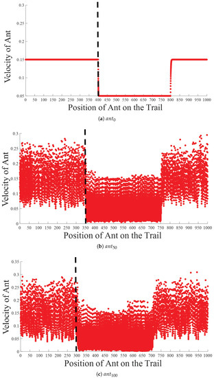 In the second case, the next cell contains no ant , but also no pheromone. Ants are sensitive to the pheromone concentration; they can detect a pheromone even at an extremely low concentration. For the simulations in this paper, we assumed that ants cannot detect pheromones below . When no pheromones are present, the ant will not have the trail; thus, to avoid wastage of energy due to high velocity, we assumed that the ants reduce their velocity or move with , whichever is higher, and the probability P gives the probability of this event (change in velocity). Conversely, the agents maintain the same velocity as t with the probability . In the second case, we assumed that , which represents high sensitivity of the ant to absence of the pheromone. After a velocity reduction, the final velocity is calculated with consideration of . For the simulations in this paper, was chosen in such a way that it would avoid backwards motion due to . Therefore, we needed to choose an value that was always greater than . On the other hand, a larger value of led to a smaller velocity range. Therefore, to maximize the velocity range, we chose (for further explanation on , check Appendix A.1).