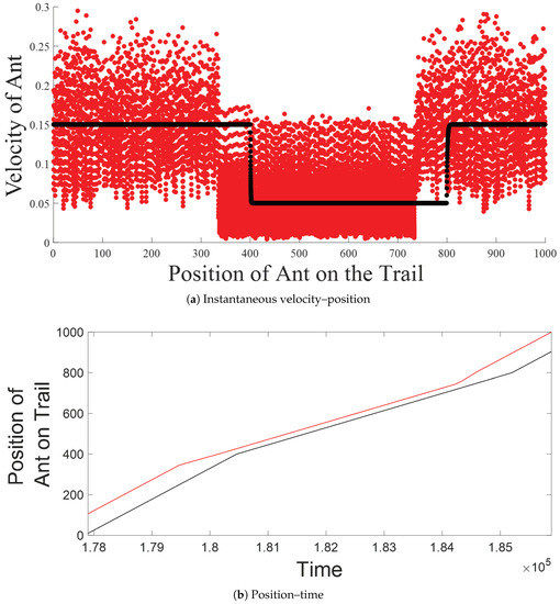 In the early studies, it was argued that individual ants on a trail have convergent behavior, which leads to the formation of multiple platoons [26]. However, the more recent studies argued that not just individual ants, but also platoons have convergent behavior, and if given sufficient time, all the platoons merge to form a single platoon [5,12,14,27]. It is also argued that ants inside a platoon march together (move with the same ) [14]. As explained earlier, in the paper, the above two arguments—platoon formation and marching ants—are collectively called the marching platoon hypothesis. In the case of the marching platoon scenario, all the ants in the same platoon should have the same . Therefore, to test the hypothesis, we observed the of different ants from the same platoon in an ATM simulation. For this analysis, we chose three ants (, , and ) from the same notional platoon: was the leader of the platoon, while was the last ant in the platoon. The environment of the selected ants was kept undisturbed, and a simulation was carried out on a heterogeneous trail. In this scenario, L was 1000 units, of which the section from – was the high-resistance part (). Therefore, the junction between and marked the beginning of a bottleneck, and the junction between and marked its downstream end. Because the value of for the high-resistance section () was higher than that for the low-resistance part (), we expected the of an ant in the high-resistance part to be lower than that of one in the other part of the trail. Therefore, changes in the velocities of different ants were observed with respect to the position of an ant on the trail.