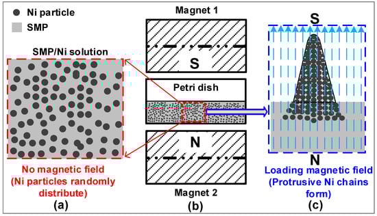 Illustration of preparation setup for vertical protrusive Shape Memory Polymer/Nickel (SMP/Ni) chains. (a) Random distribution of SMP/Ni solution without applying magnetic field; (b) Setup for preparing SMP/Ni vertical chain arrays; (c) Formation of SMP/Ni vertical chain arrays with applying magnetic field.
