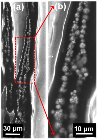 Nickel particles chains in Shape Memory Polymer (SMP) matrix. (a) Morphology of nickel particles chains; (b) Zoomed-in view of (a).