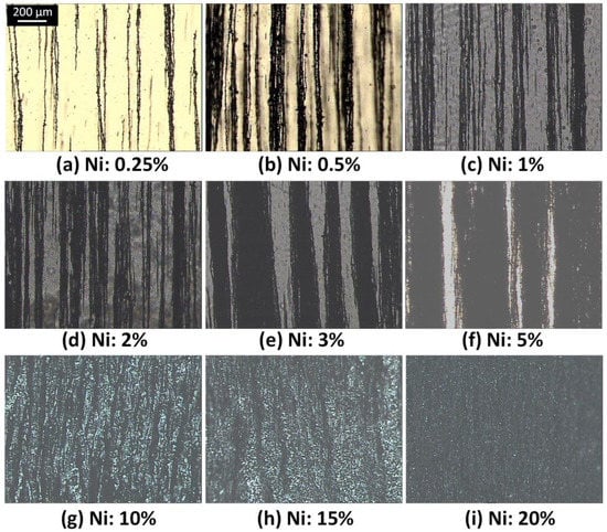 The volume fraction of nickel particles was also controlled in a proper range, namely 1–5%. When it was lower than 1% (e.g., 0.5%), the diameter of vertical chains reduced to 3–20 μm with the interval distance 200–1000 μm (Figure 4a,b). Alternatively, when it was higher than 1% (e.g., 10%, 15% and 20%) the nickel particles aggregated into relative thick chains without forming regular chain arrays (Figure 4g–i). Therefore, for the fabrication of SMP/Ni vertical chains, the volume fractions 1%, 2%, 3%, and 5% were employed in this study.