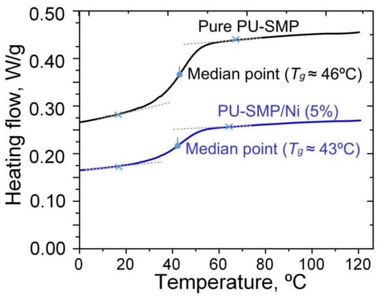 Differential Scanning Calorimetry (DSC) results of pure polyurethane-based Shape Memory Polymer (SMP) and SMP/Ni (Nickel) composite.
