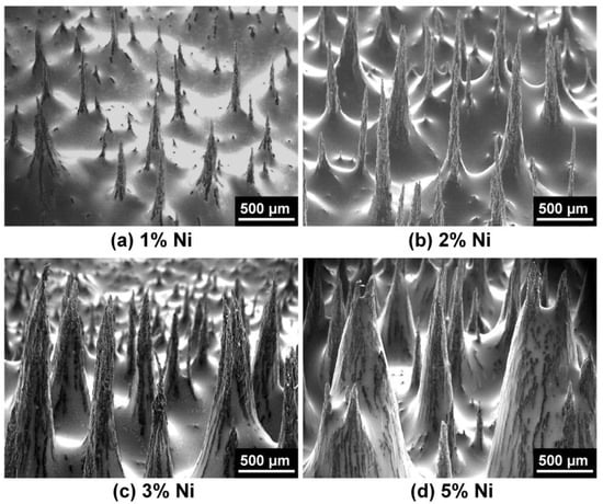 Considering the size of nickel particles, its diameters 3–7 μm are at microscale level, and the proper volume fractions for SMP/Ni mixture to form relative well vertical arrays are around 2–3%, as shown in Figure 3, Figure 4, Figure 6 and Figure 7. Moreover, it is predicted that, when the size of nickel particles is smaller, the appropriate volume fractions as well as dimensions will also reduce.