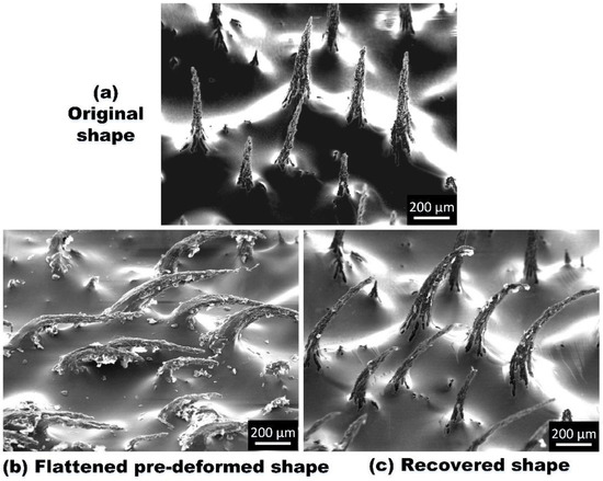 As illustrated in Figure 8, we heat initially vertical chains (Figure 8a) to 120 °C (well above Tg Tg = 43 °C–46 °C) for 20 min. After that, a piece of aluminum plate is placed atop the sample. Hence, the chain is flattened (Figure 8b). Subsequently, the SMP/Ni vertical chains are gradually cooled in the bending and flattened configuration while keeping the aluminum plate there. After the removal of the aluminum plate, the nickel protrusive chains are still in the bend-shape as shown in Figure 8c. Upon heating to 120 °C, if the chains can recover its initial shape (Figure 8d), the shape memory effect of SMP is demonstrated at microscale and nanoscale.