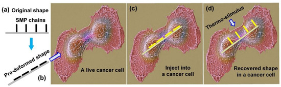 Schematic illustration of the delivery and operation procedure of microscale Shape Memory Polymer (SMP) brush machine in a live cancer cell. (The live cancer cell is referred to in Reference [39]). (a) Original shape of SMP chain pillars; (b) Pre-deformed SMP chain pillars; (c) Pre-deformed SMP chain pillars injected into a cancer cell; (d) Recovered SMP chain pillars in a cancer cell.