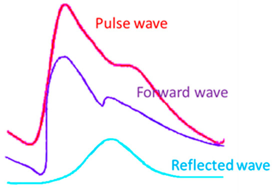 Red line represents the pulse wave, blue line represents the forward wave, light blue line represents the reflected wave.